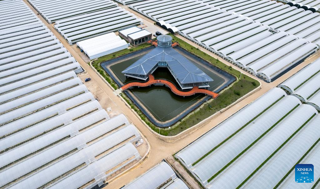 An aerial drone photo taken on July 9, 2024 shows the water reservoir at a blueberry plantation base of Hortifrut and Joyvio in Mengzi, southwest China's Yunnan Province. (Xinhua/Chen Xinbo)
