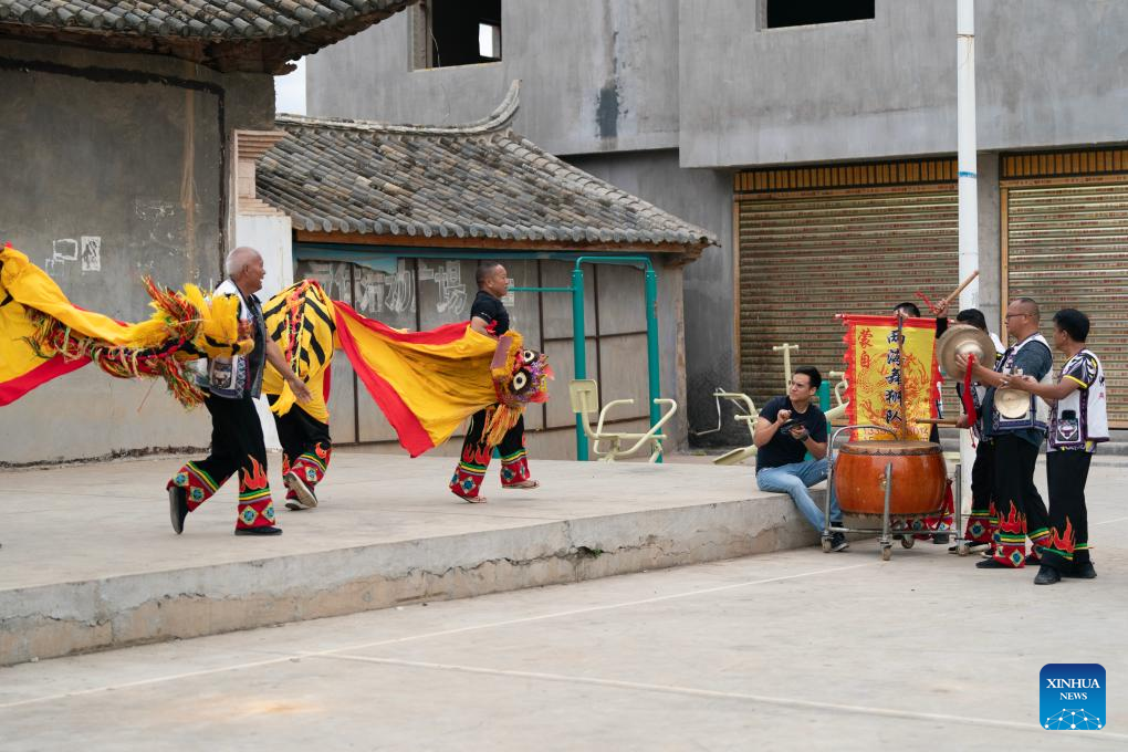 Marcelo Vergaray (4th L) makes cymbal accompaniment for a local lion dance team in Shilipu Village of Mengzi, southwest China's Yunnan Province, July 10, 2024. (Xinhua/Chen Xinbo)
