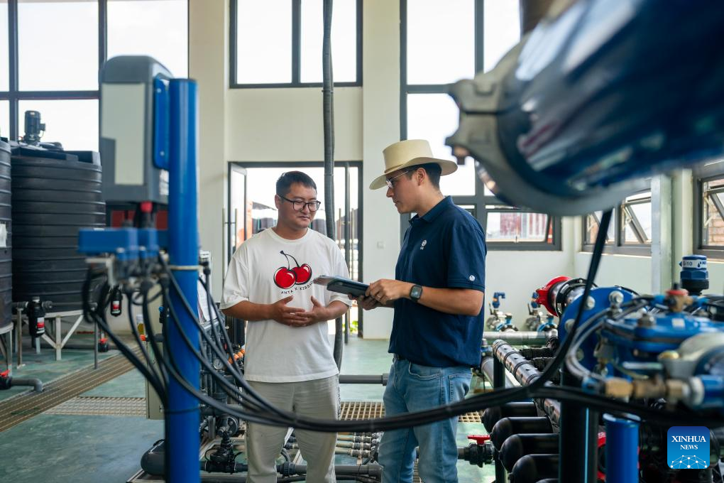 Marcelo Vergaray (R) and Song Junhong, the director of a blueberry plantation base, talk about the operation of the water and fertilizer integrated pump room in Mengzi, southwest China's Yunnan Province, July 9, 2024. (Xinhua/Chen Xinbo)