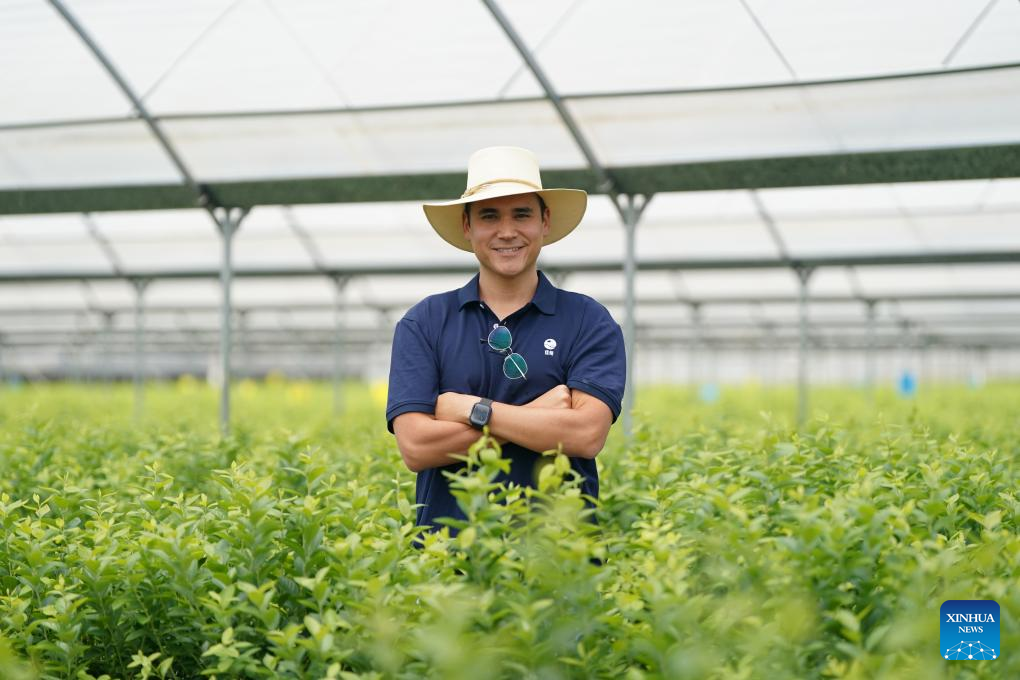 Marcelo Vergaray poses for a photo at a blueberry greenhouse in Mengzi, southwest China's Yunnan Province, July 9, 2024. (Xinhua/Chen Xinbo)