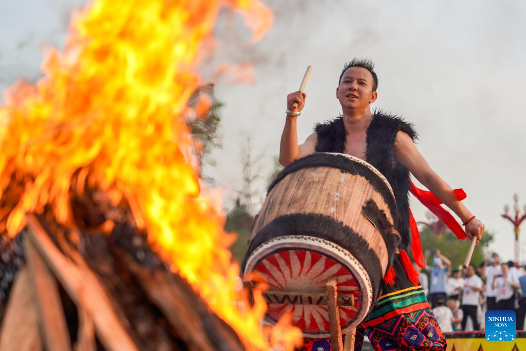 An actor beats a drum to welcome visitors at a torch festival in Chuxiong, southwest China's Yunnan Province, July 27, 2024.