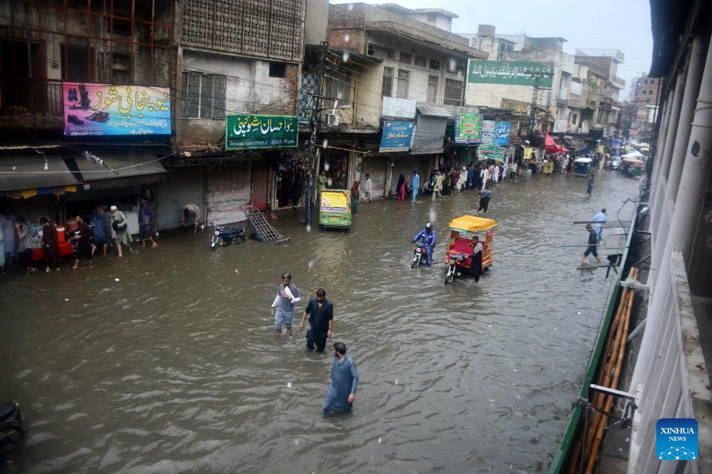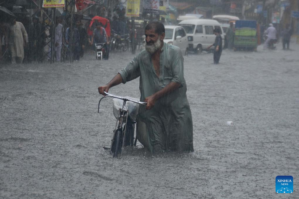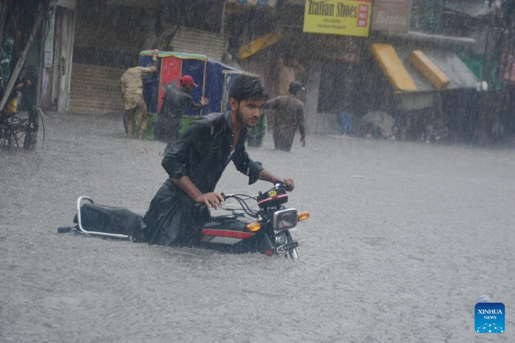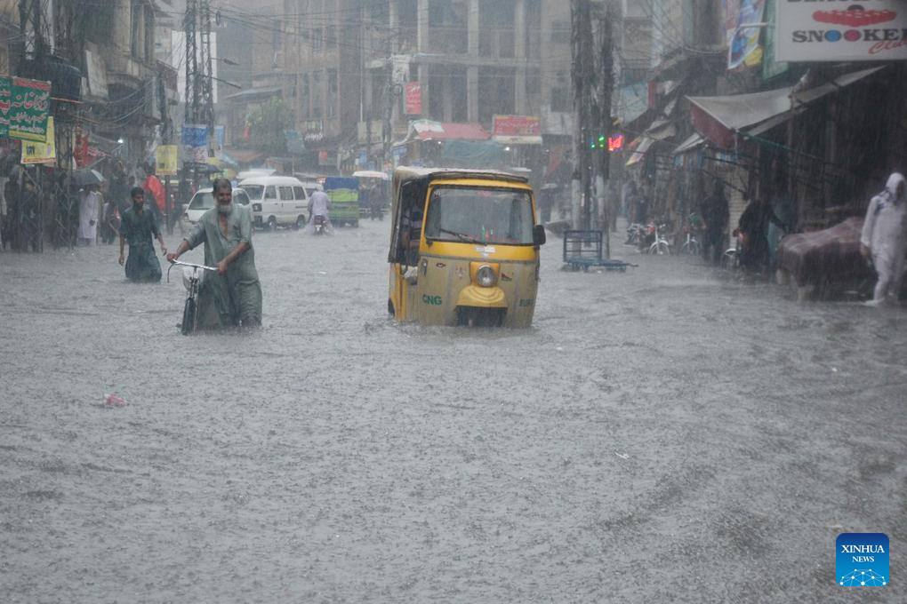 Commuters are seen on a flooded road during heavy monsoon rain in Rawalpindi, Pakistan, on July 29, 2024. (Str/Xinhua)