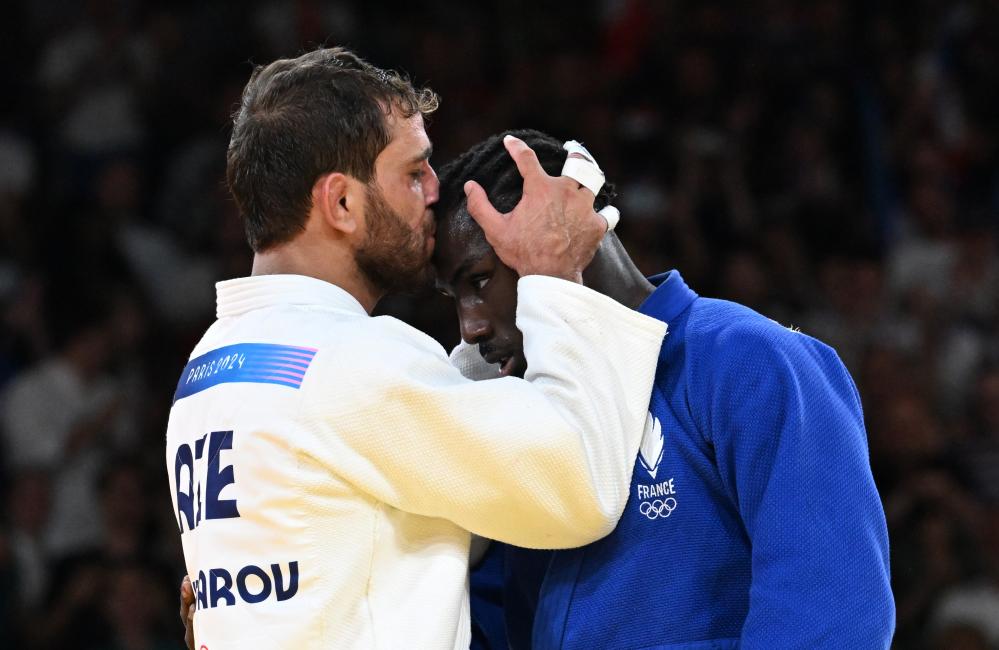Hidayat Heydarov (L) of Azerbaijan kisses the forehead of Joan-Benjamin Gaba of France after the judo men's 73kg final at Paris 2024, on July 29, 2024. (Xinhua/Li An)