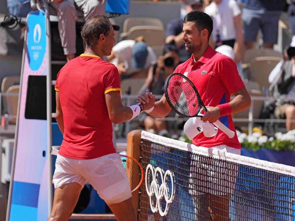 Rafael Nadal (L) shakes hands with Novak Djokovic after their men's singles second round match at Paris 2024, on July 29, 2024. (Xinhua/Wan Xiang)
