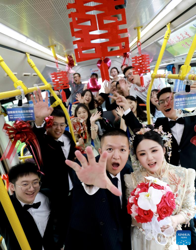 A newlywed couple hold their wedding party on a bus in Fuling District, southwest China's Chongqing Municipality, May 12, 2024. (Xinhua)