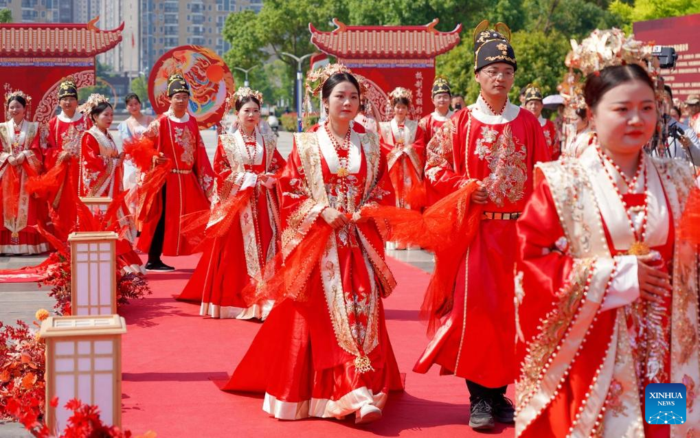 A collective wedding ceremony is held in Xinzhou District, Wuhan City of central China's Hubei Province, May 18, 2024. (Xinhua)