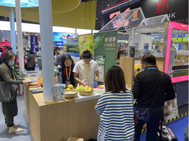 Keo Romeat mangoes from Cambodia attract many visitors at the CIIE. [Photo/Yunnan Daily]