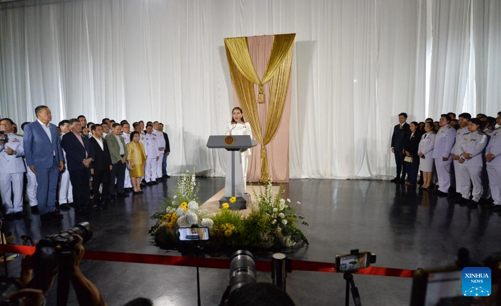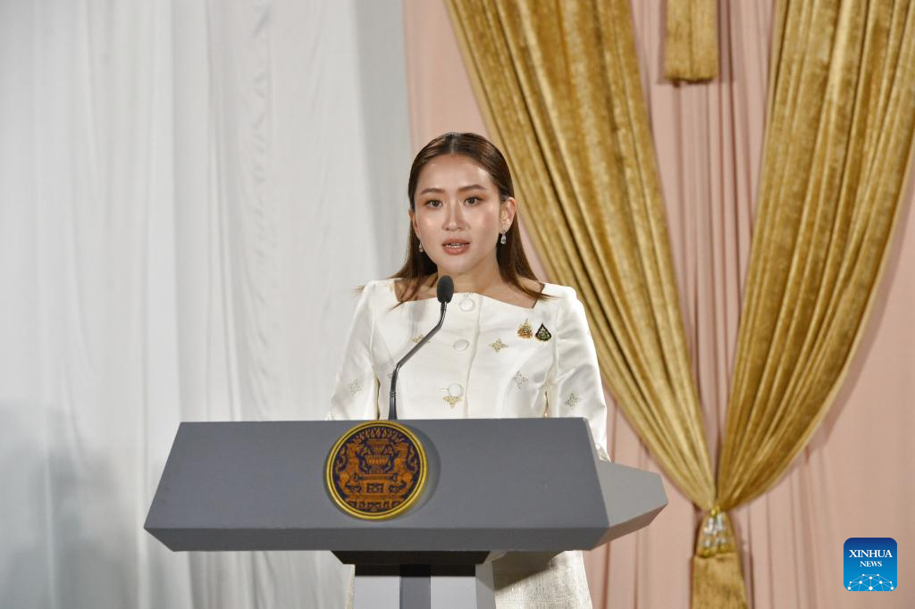 Thailand's new Prime Minister Paetongtarn Shinawatra (1st R) gives a speech after receiving the royal endorsement for the post at the headquarters of the Pheu Thai party in Bangkok, Thailand, Aug. 18, 2024. Thailand's King Maha Vajiralongkorn has appointed Paetongtarn Shinawatra as the country's prime minister, Secretary-General of the House of Representatives Arpath Sukhanunth announced on Sunday. (Thai Government House/Handout via Xinhua)