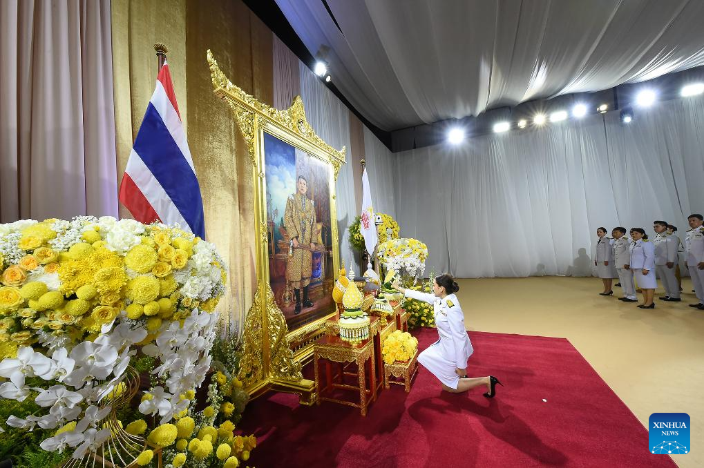 Thailand's new Prime Minister Paetongtarn Shinawatra pays respect to a portrait of King Maha Vajiralongkorn as she receives the royal endorsement at a ceremony held at the headquarters of the Pheu Thai party in Bangkok, Thailand, Aug. 18, 2024. Thailand's King Maha Vajiralongkorn has appointed Paetongtarn Shinawatra as the country's prime minister, Secretary-General of the House of Representatives Arpath Sukhanunth announced on Sunday. (Thai Government House/Handout via Xinhua)