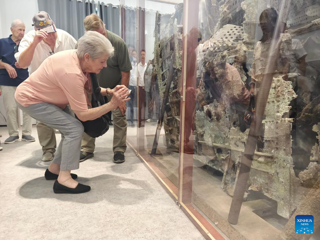 Margaret Kincannon, daughter of a veteran of Flying Tigers, takes pictures of wreckage from Flying Tigers bombers displayed at an exhibition in Huimin Village in Anqing City, east China's Anhui Province, Sept. 10, 2024.(Xinhua/Guo Chen)