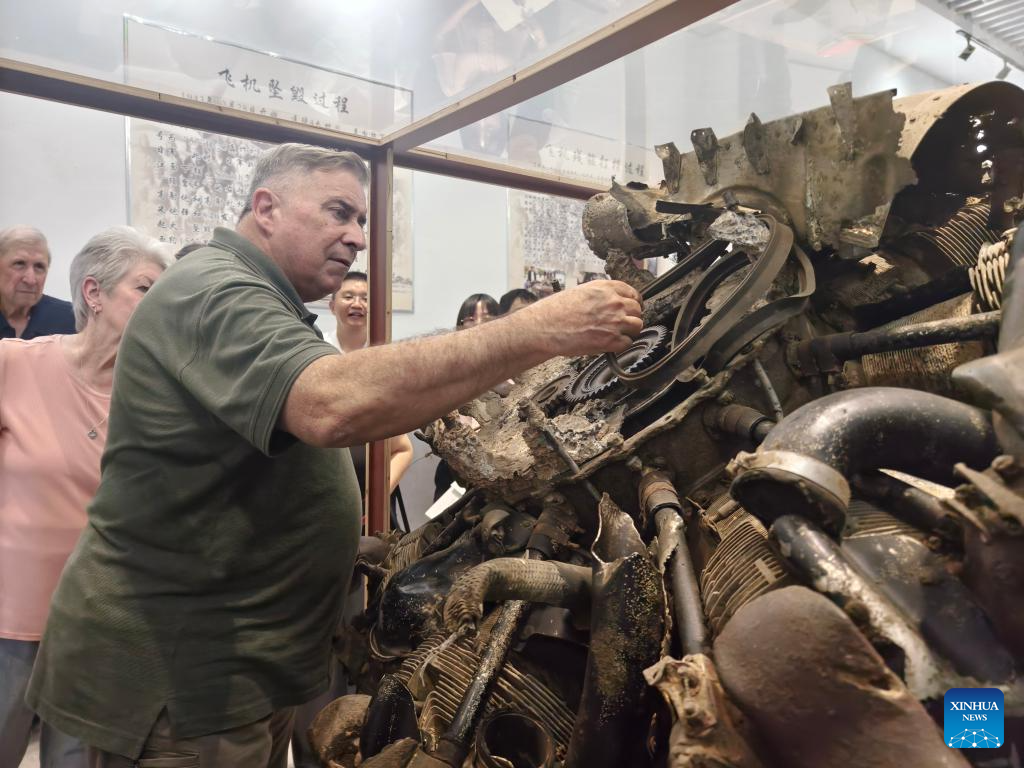 Jeffrey Greene, chairman of the Sino-American Aviation Heritage Foundation, has a touch of the wreckage from Flying Tigers bombers displayed at an exhibition in Huimin Village in Anqing City, east China's Anhui Province, Sept. 10, 2024.(Xinhua/Guo Chen)