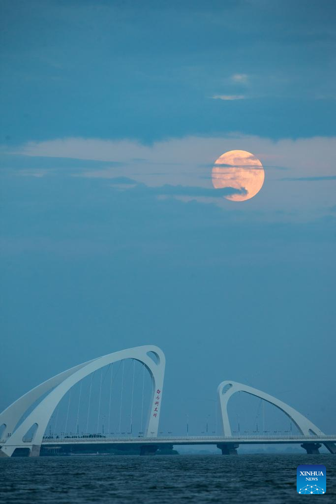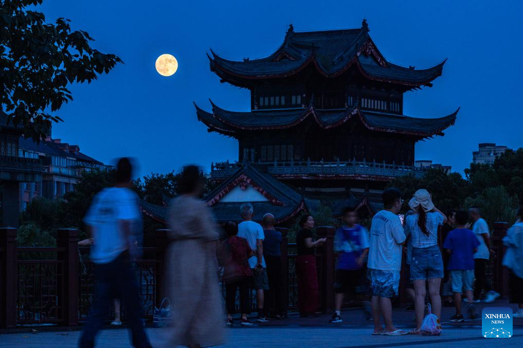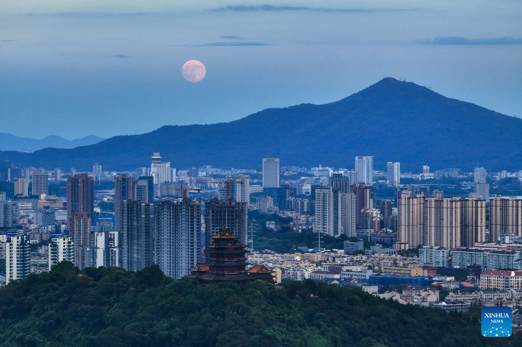 The moon rises above Huzhou City, east China's Zhejiang Province, Sept. 17, 2024. The Mid-Autumn Festival in China, which is celebrated annually on the 15th day of the eighth month in the Chinese lunar calendar, falls on Sept. 17 this year. As one of China's most important traditional holidays, it is a joyous time when families come together, appreciate the full moon and share moon cakes, a traditional pastry, to mark the harvest season. (Photo by Yi Fan/Xinhua)