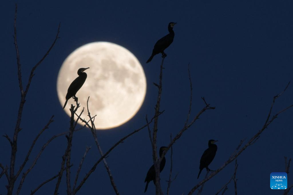 The silhouette of a cormorant is pictured in front of a full moon in Qiqihar, northeast China's Heilongjiang Province, Sept. 17, 2024. The Mid-Autumn Festival in China, which is celebrated annually on the 15th day of the eighth month in the Chinese lunar calendar, falls on Sept. 17 this year. As one of China's most important traditional holidays, it is a joyous time when families come together, appreciate the full moon and share moon cakes, a traditional pastry, to mark the harvest season. (Photo by Wang Yonggang/Xinhua)