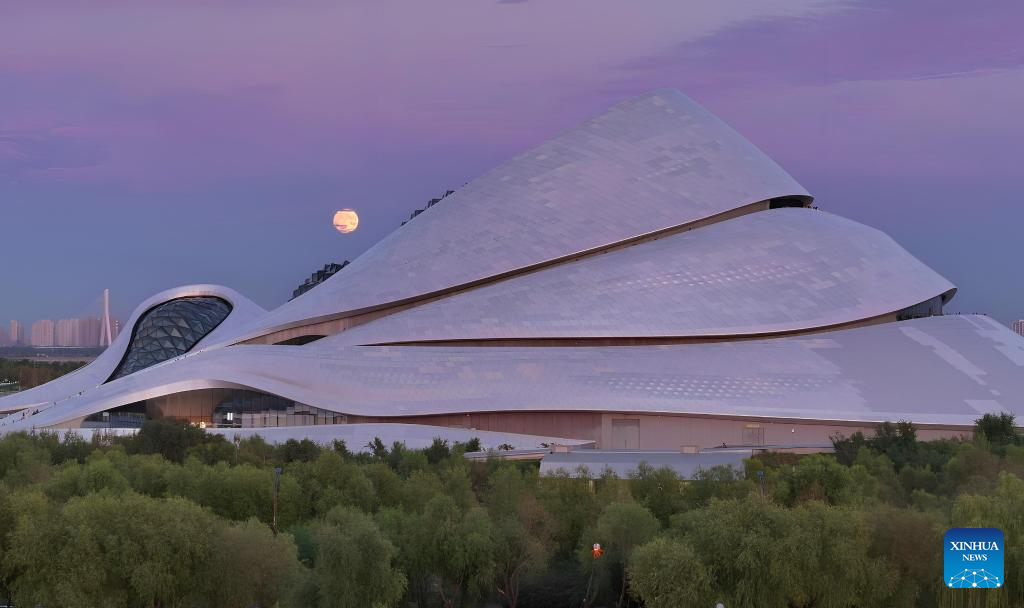 The moon rises above the Harbin Grand Theater in Harbin, northeast China's Heilongjiang Province, Sept. 17, 2024. The Mid-Autumn Festival in China, which is celebrated annually on the 15th day of the eighth month in the Chinese lunar calendar, falls on Sept. 17 this year. As one of China's most important traditional holidays, it is a joyous time when families come together, appreciate the full moon and share moon cakes, a traditional pastry, to mark the harvest season. (Photo by Zhang Shu/Xinhua)