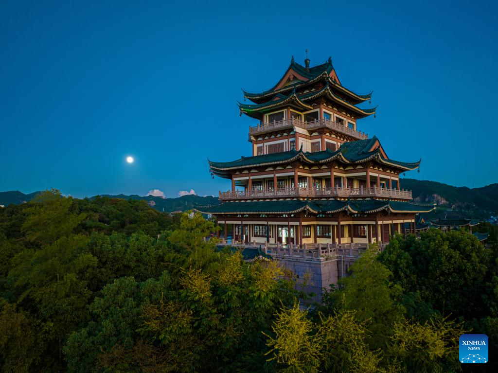 The moon rises above Huangyan District of Taizhou, east China's Zhejiang Province, Sept. 17, 2024. The Mid-Autumn Festival in China, which is celebrated annually on the 15th day of the eighth month in the Chinese lunar calendar, falls on Sept. 17 this year. As one of China's most important traditional holidays, it is a joyous time when families come together, appreciate the full moon and share moon cakes, a traditional pastry, to mark the harvest season. (Photo by Pan Kanjun/Xinhua)