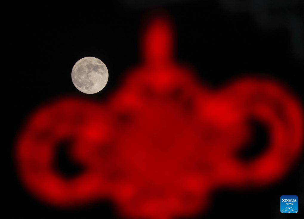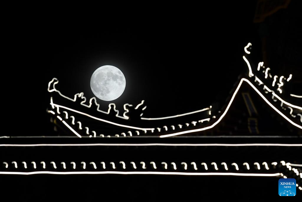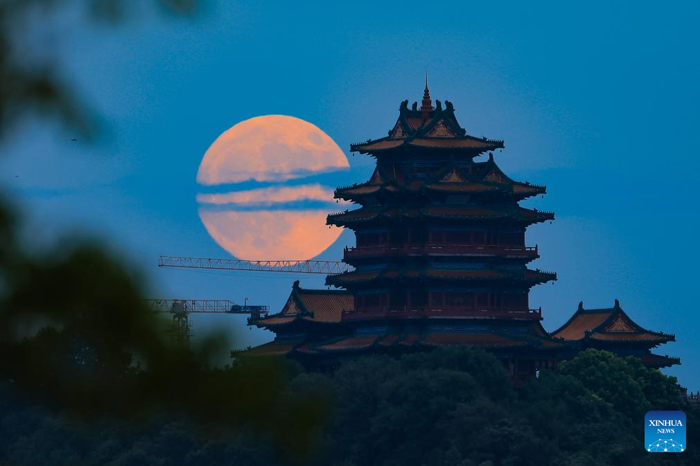 The moon rises above Nanjing, east China's Jiangsu Province, Sept. 17, 2024. The Mid-Autumn Festival in China, which is celebrated annually on the 15th day of the eighth month in the Chinese lunar calendar, falls on Sept. 17 this year. As one of China's most important traditional holidays, it is a joyous time when families come together, appreciate the full moon and share moon cakes, a traditional pastry, to mark the harvest season. (Photo by Fang Dongxu/Xinhua)
