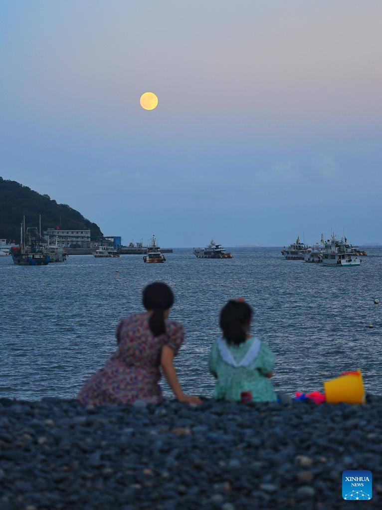 A mother and daughter enjoy the full moon by the sea in Zhoushan City, east China's Zhejiang Province, Sept. 17, 2024. The Mid-Autumn Festival in China, which is celebrated annually on the 15th day of the eighth month in the Chinese lunar calendar, falls on Sept. 17 this year. As one of China's most important traditional holidays, it is a joyous time when families come together, appreciate the full moon and share moon cakes, a traditional pastry, to mark the harvest season. (Photo by Xing Shoumiao/Xinhua)