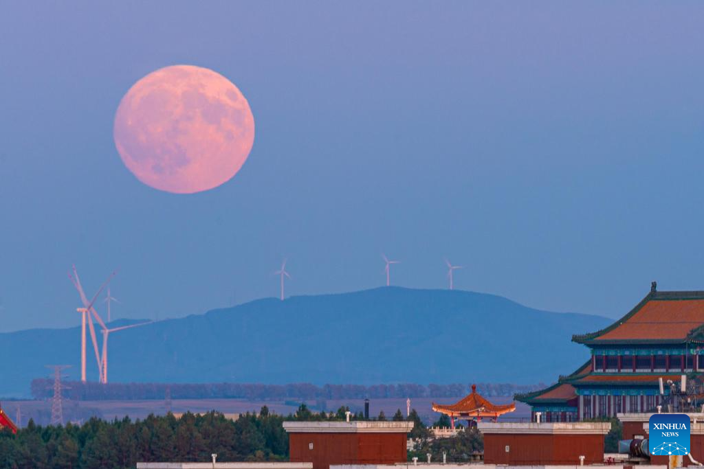 The moon rises above Jiamusi City, northeast China's Heilongjiang Province, Sept. 17, 2024. The Mid-Autumn Festival in China, which is celebrated annually on the 15th day of the eighth month in the Chinese lunar calendar, falls on Sept. 17 this year. As one of China's most important traditional holidays, it is a joyous time when families come together, appreciate the full moon and share moon cakes, a traditional pastry, to mark the harvest season. (Photo by Chen Zhiguo/Xinhua)