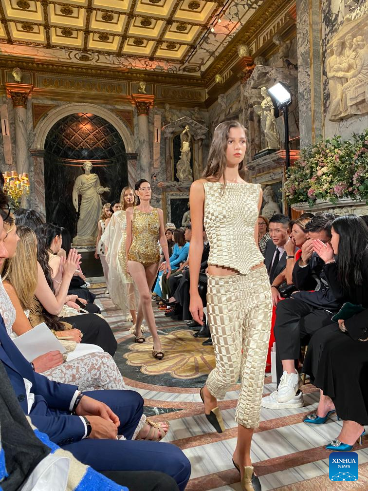 Models present creations of Chinese designer Zhong Zixin during a fashion show in London, Britain, Sept. 17, 2024. (Xinhua/Jin Jing)