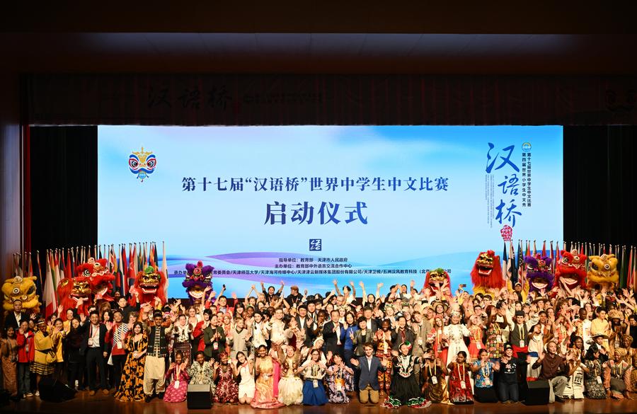 Competitors attend the opening ceremony of the 17th "Chinese Bridge" Chinese proficiency competition for foreign secondary school students in north China's Tianjin, Oct. 17, 2024. (Xinhua/Li Ran)