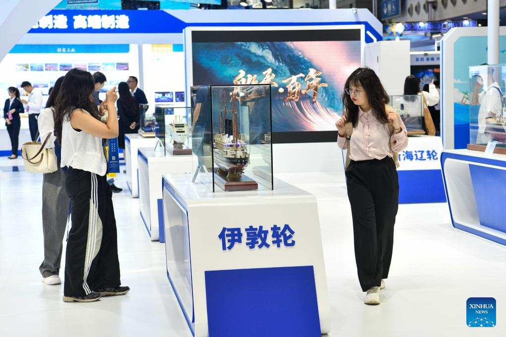 Visitors view a ship model at the 2024 China Marine Economy Expo (CMEE) in Shenzhen, south China's Guangdong Province on Oct. 31, 2024. The 2024 CMEE kicked off in Shenzhen on Thursday, comprehensively showcasing China's marine economic development, and scientific and technological innovation. (Xinhua/Liang Xu)
