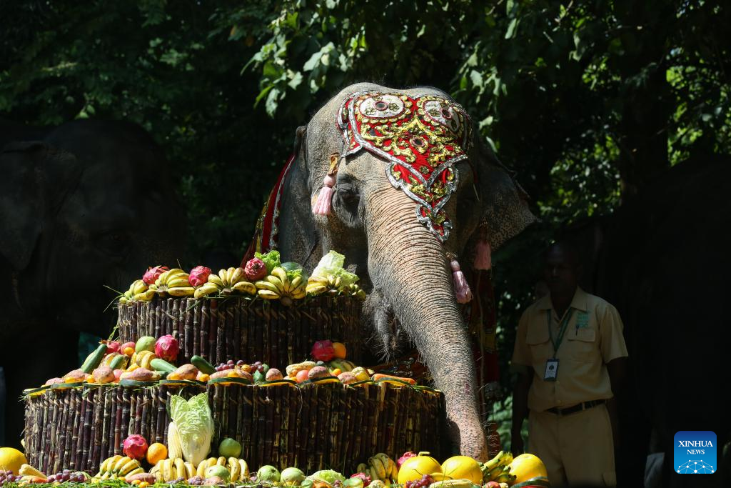 Momo, a renowned female Asian elephant at the Yangon Zoological Gardens, celebrates her 71st birthday in Yangon, Myanmar, Nov. 3, 2024. The festivities, held from Nov. 1 to 3, included a variety of activities such as a music show, talk show, and games, culminating in a special birthday cake prepared for her on Nov. 3. (Xinhua/Myo Kyaw Soe)