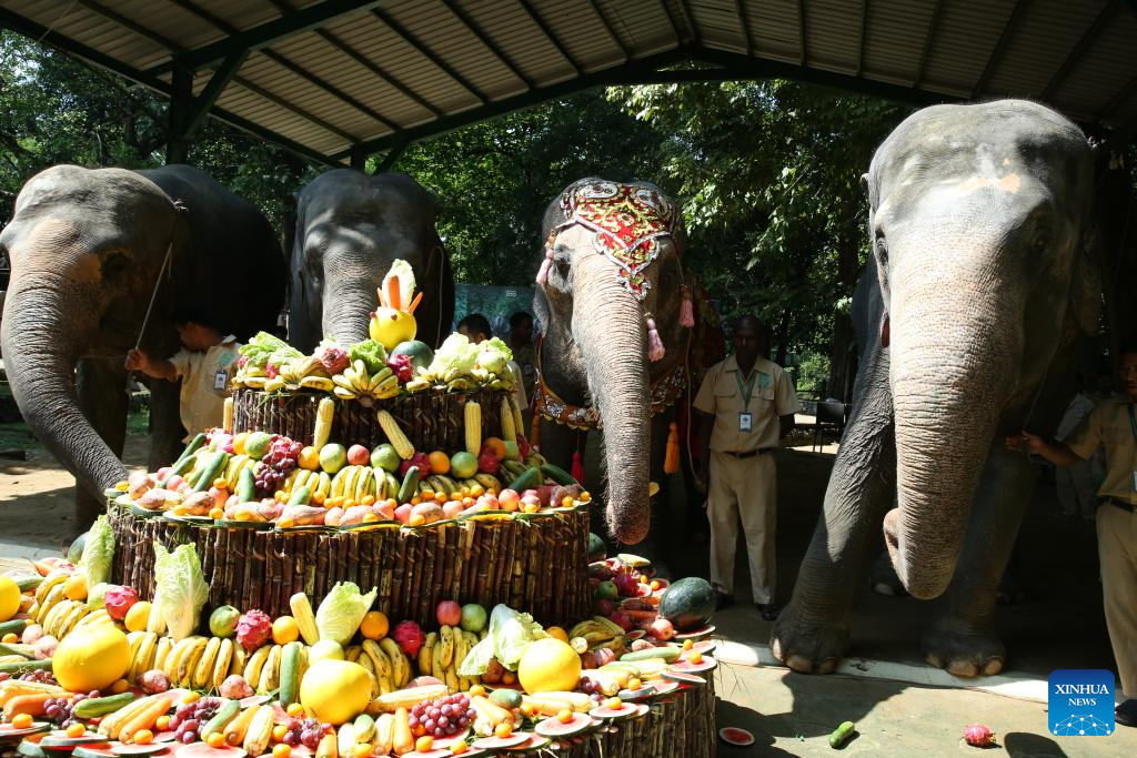 Momo (2nd R), a renowned female Asian elephant at the Yangon Zoological Gardens, celebrates her 71st birthday in Yangon, Myanmar, Nov. 3, 2024. The festivities, held from Nov. 1 to 3, included a variety of activities such as a music show, talk show, and games, culminating in a special birthday cake prepared for her on Nov. 3. (Xinhua/Myo Kyaw Soe)