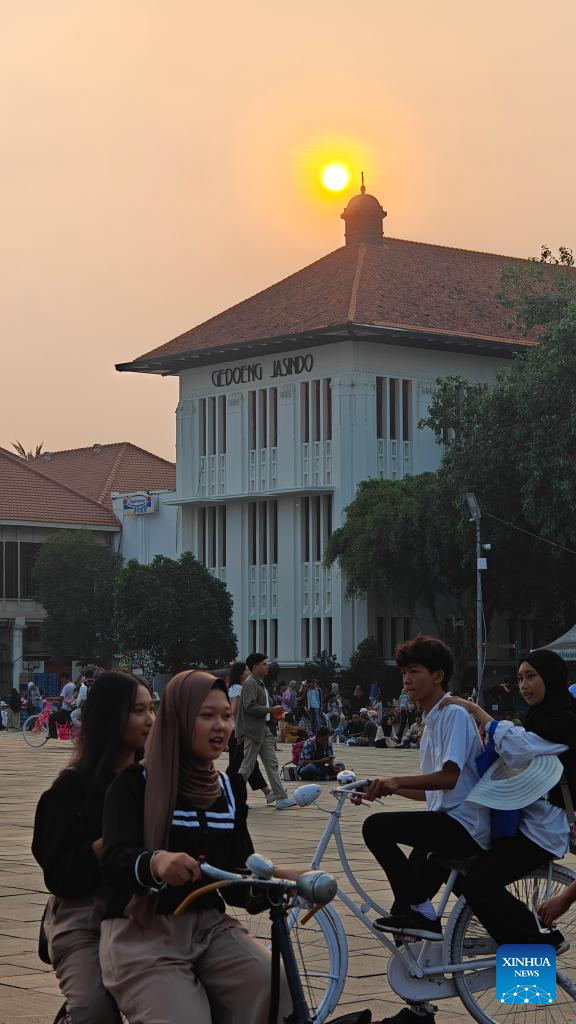 This photo taken with a mobile phone shows people riding bikes in Taman Fatahillah in Jakarta, Indonesia, July 11, 2024. Located on the northwest coast of Java Island, Jakarta is the largest city in Indonesia and is currently the political, economic and cultural center of the country. (Xinhua/Xu Qin)