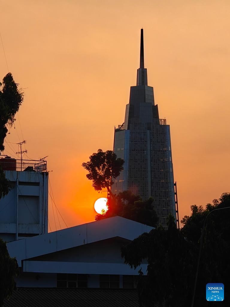 This photo taken with a mobile phone shows sunset view near KOMPAS Multimedia Tower in Jakarta, Indonesia, July 12, 2024. Located on the northwest coast of Java Island, Jakarta is the largest city in Indonesia and is currently the political, economic and cultural center of the country. (Xinhua/Xu Qin)