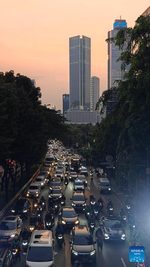 This photo taken with a mobile phone shows traffic flow during the evening rush hour in Jakarta, Indonesia, Oct. 8, 2024. Located on the northwest coast of Java Island, Jakarta is the largest city in Indonesia and is currently the political, economic and cultural center of the country. (Xinhua/Xu Qin)