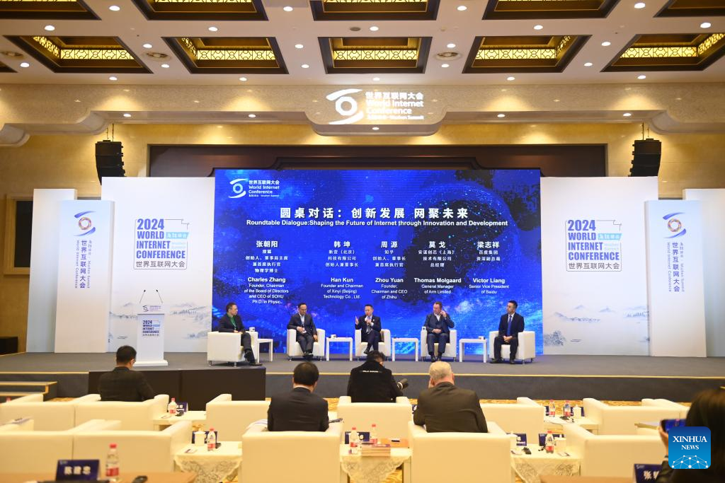 Guests attend a roundtable during the 2024 World Internet Conference (WIC) Wuzhen Summit in Wuzhen, east China's Zhejiang Province, Nov. 21, 2024. The 2024 WIC Wuzhen Summit kicked off on Wednesday morning in the ancient water town of Wuzhen in east China's Zhejiang Province. (Xinhua/Huang Zongzhi)