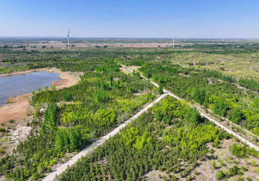 An aerial drone photo taken on May 15, 2024 shows tree seedlings planted at an afforestation area in the Horqin sandy land in Tongliao city, North China's Inner Mongolia autonomous region. [Photo/Xinhua]