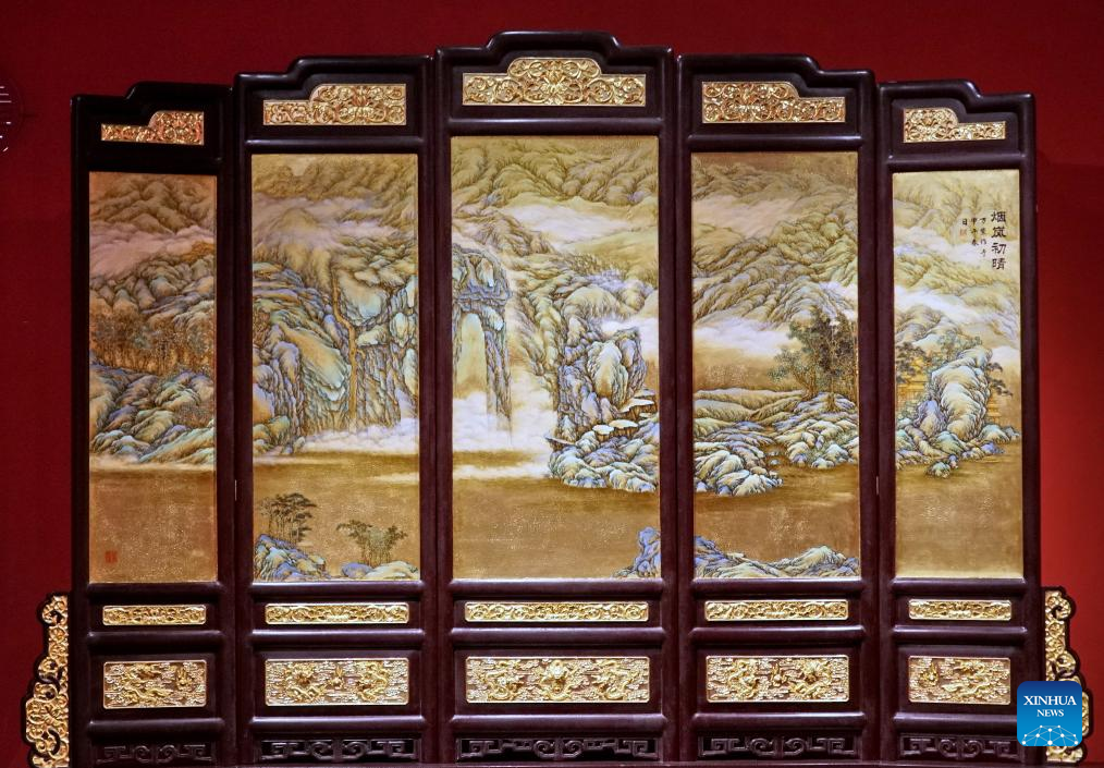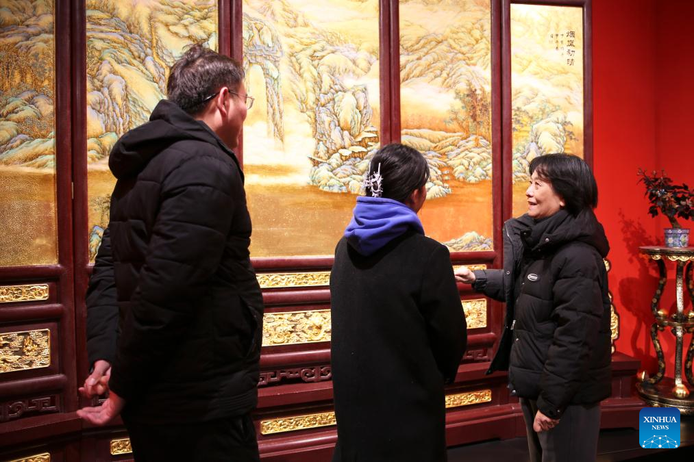A Gold Lacquer Inlay Art screen is displayed at the Beijing Gold Lacquer Inlay Art Museum in Beijing, capital of China, Dec. 10, 2024. (Xinhua/Li Xin)