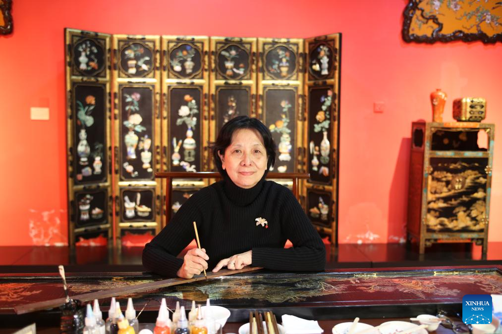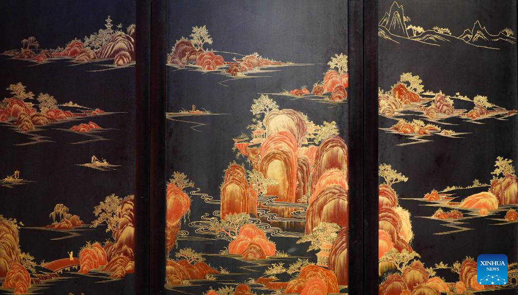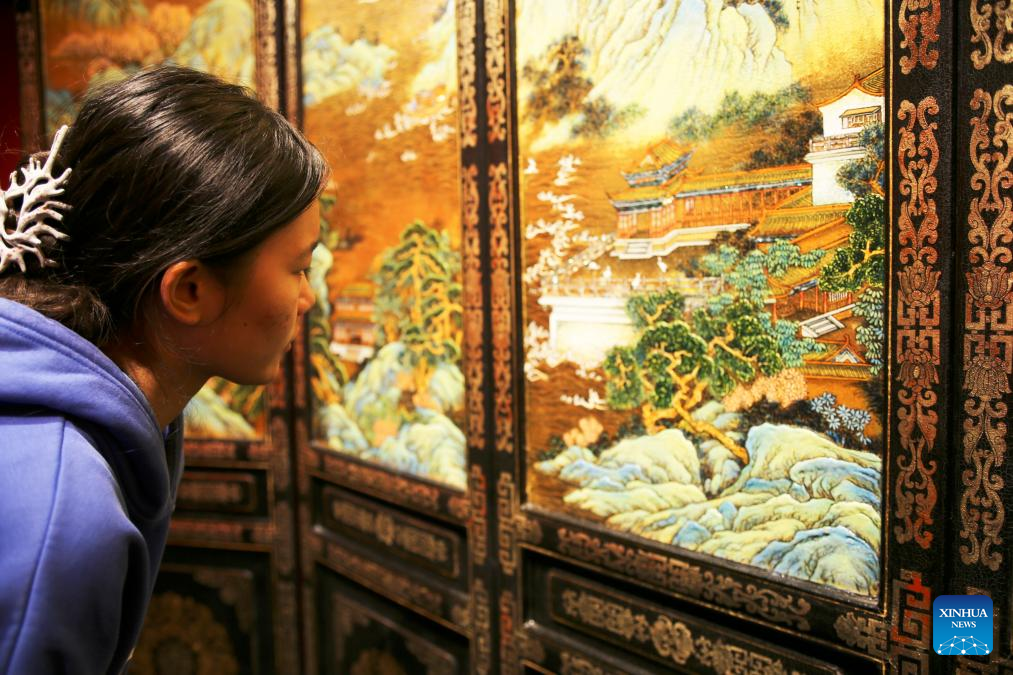 Furniture of Gold Lacquer Inlay Art are displayed at the Beijing Gold Lacquer Inlay Art Museum in Beijing, capital of China, Dec. 10, 2024. Gold Lacquer Inlay Art, a main category of traditional Chinese lacquer art, has a history of more than 7,000 years. The Beijing gold lacquer inlay art, developing on the basis of the imperial art dating back to the Ming (1368-1644) and Qing (1644-1911) dynasties, has formed a classically elegant and splendid Beijing-style. The art has been applied to a wide range of aspects in life, from pillars in ancient buildings, screens, thrones and furniture in the palace, to tableware, tea sets, writing materials and jewelry in people's daily life.