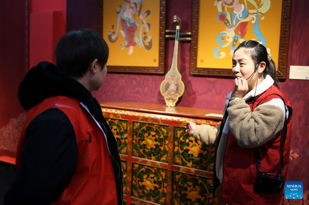 A staff member introduces a Gold Lacquer Inlay Art cabinet to a visitor at the Beijing Gold Lacquer Inlay Art Museum in Beijing, capital of China, Dec. 10, 2024. (Xinhua/Zhu Weixi)