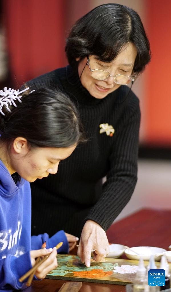 Hu Xin instructs an apprentice on a Gold Lacquer Inlay artwork at the Beijing Gold Lacquer Inlay Art Museum in Beijing, capital of China, Dec. 10, 2024. (Xinhua/Li Xin)