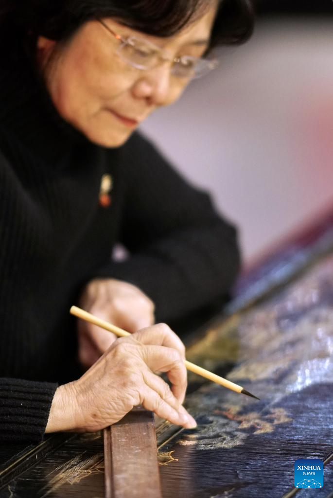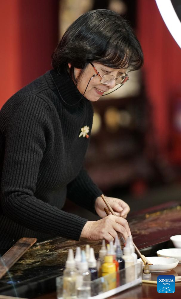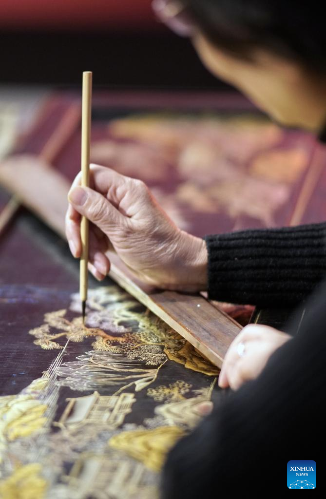 Hu Xin paints colors on a Gold Lacquer Inlay artwork at the Beijing Gold Lacquer Inlay Art Museum in Beijing, capital of China, Dec. 10, 2024. (Xinhua/Li Xin)