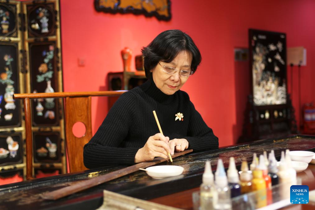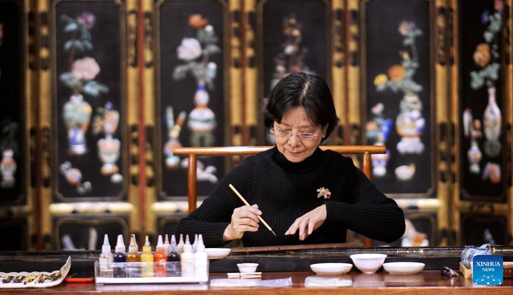 Hu Xin paints colors on a Gold Lacquer Inlay artwork at the Beijing Gold Lacquer Inlay Art Museum in Beijing, capital of China, Dec. 10, 2024. (Xinhua/Qi Zhiyue)
