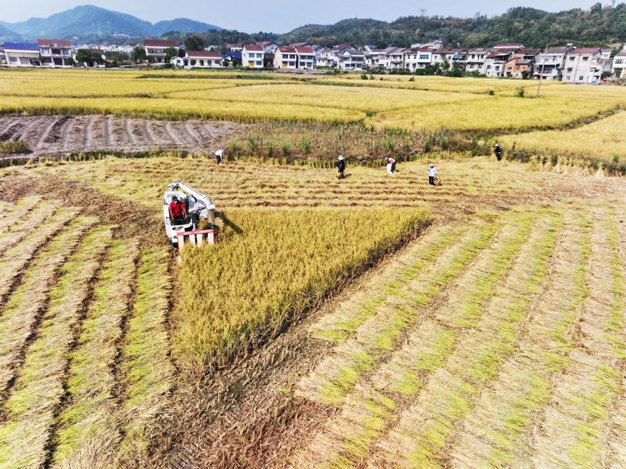 An aerial drone photo shows a harvester working in rice paddies in Luoping village of Lixian county, Central China's Hunan province, Sept 26, 2024. [Photo/Xinhua]