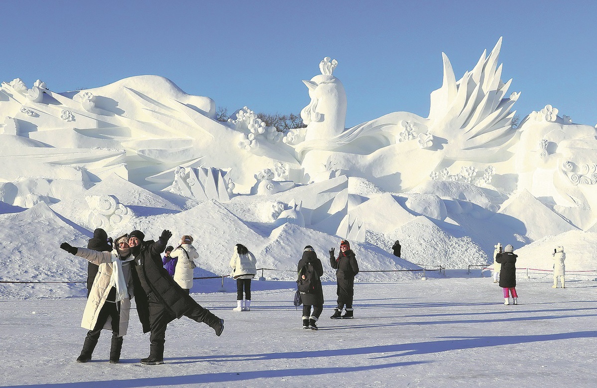 Tourists take photos in front of the main sculpture at the 37th Sun Island International Snow Sculpture Art Expo in Harbin, Heilongjiang province, on Thursday. The sculpture, 100 meters long and 30 meters high, used 30,000 cubic meters of snow and took around nine days to complete. Featuring birds and plum blossoms, the sculpture conveys the anticipation of a beautiful spring. ZHANG SHU/FOR CHINA DAILY