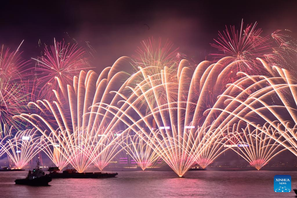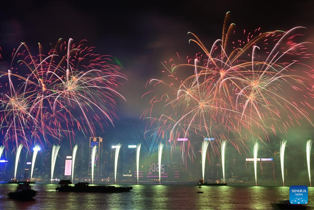 Fireworks illuminate the sky over Victoria Harbour in celebration of the new year in Hong Kong, south China, Jan. 1, 2025. (Xinhua/Zhu Wei)