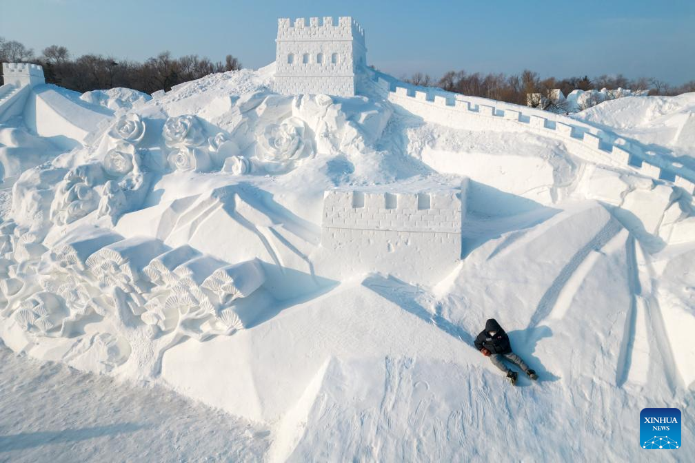 An aerial drone photo taken on Jan. 3, 2025 shows people having fun around a giant snowman near the Qunli music park in Harbin, capital of northeast China's Heilongjiang Province. Harbin, with its rich ice and snow resources and a diverse array of winter activities, has emerged as one of China's top winter travel destinations. (Xinhua/Xie Jianfei)