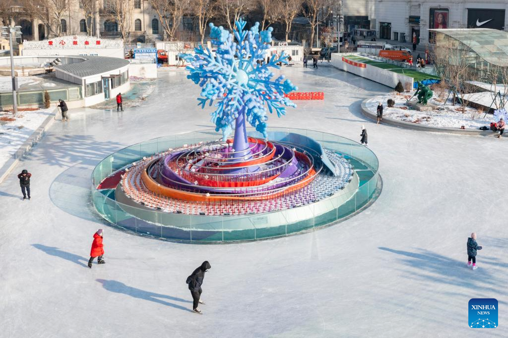 An aerial drone photo taken on Jan. 4, 2025 shows tourists having fun at a public skating rink in Harbin, northeast China's Heilongjiang Province. Harbin, with its rich ice and snow resources and a diverse array of winter activities, has emerged as one of China's top winter travel destinations. (Xinhua/Xie Jianfei)