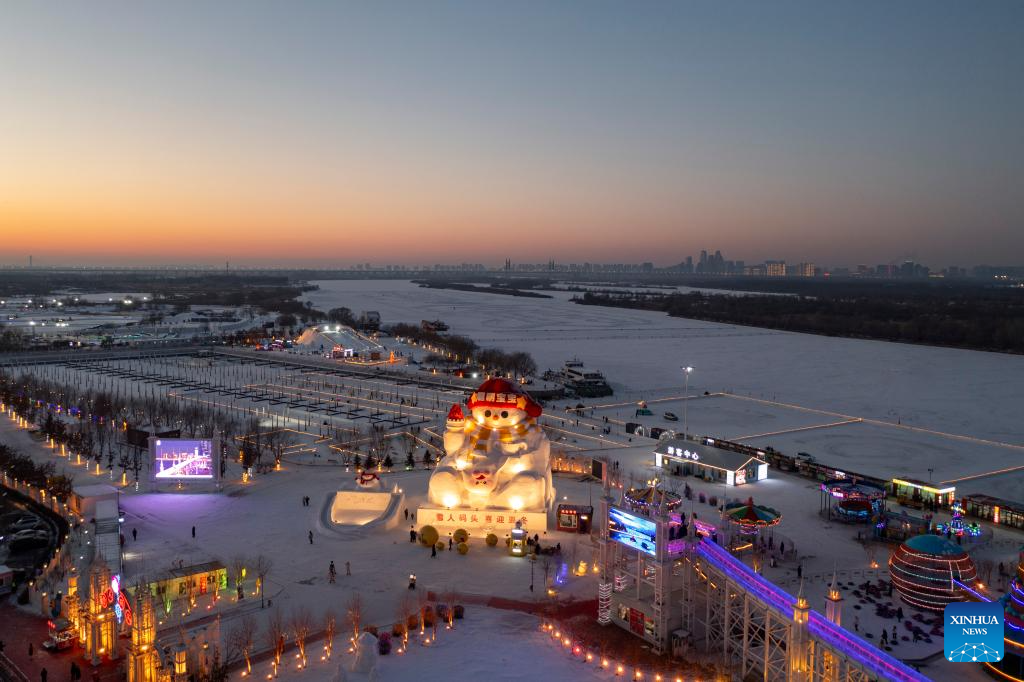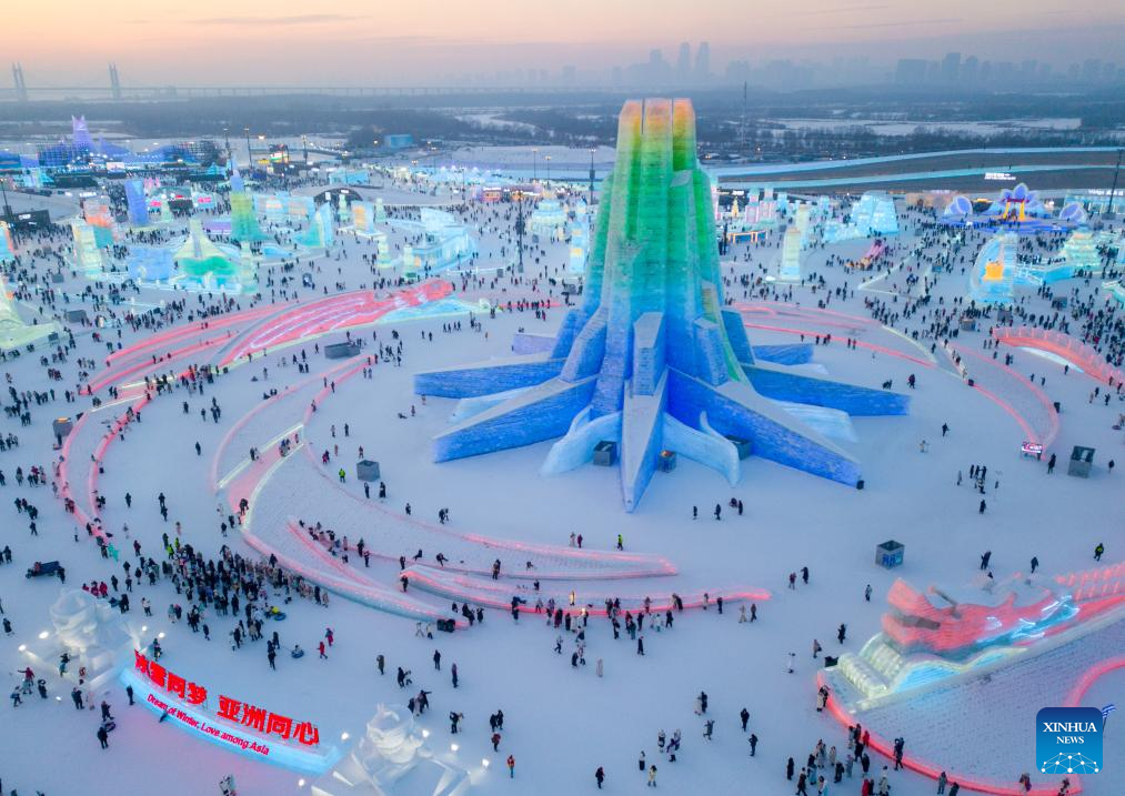 An aerial drone photo taken on Jan. 5, 2025 shows a view of the Harbin Ice-Snow World in Harbin, northeast China's Heilongjiang Province. Harbin, with its rich ice and snow resources and a diverse array of winter activities, has emerged as one of China's top winter travel destinations. (Xinhua/Wang Song)