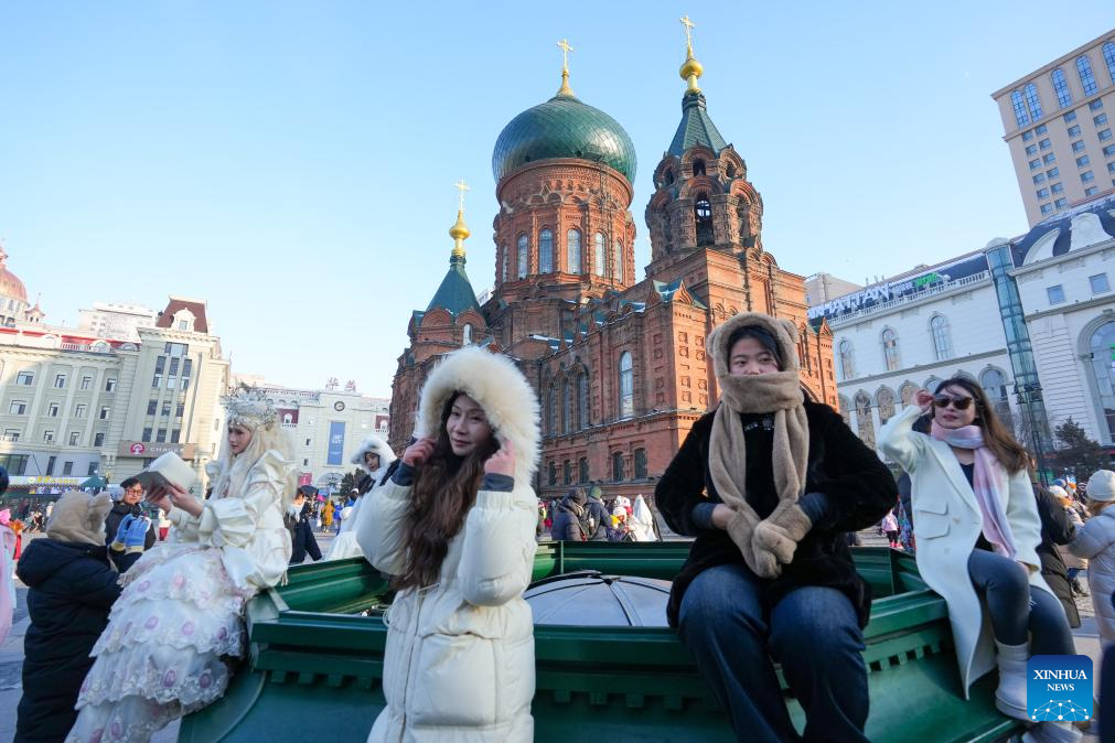 Tourists pose for photos at a square of architecture art in Harbin, northeast China's Heilongjiang Province, Jan. 5, 2025. Harbin, with its rich ice and snow resources and a diverse array of winter activities, has emerged as one of China's top winter travel destinations. (Xinhua/Wang Jianwei)