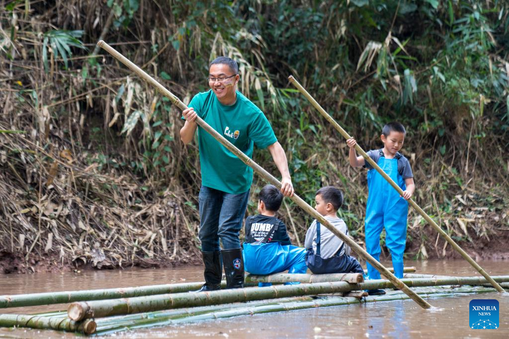 Tourists paddle a bamboo raft at Jinuoshan Town, Jinghong City of Xishuangbanna Dai Autonomous Prefecture, southwest China's Yunnan Province, Jan. 5, 2025.