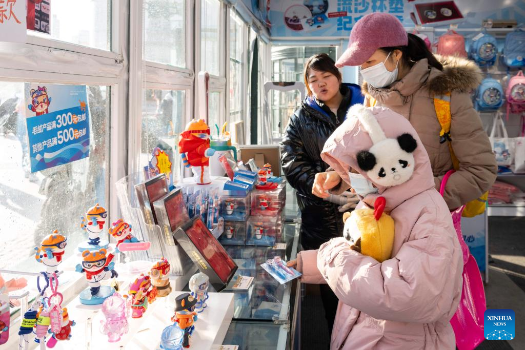Visitors choose souvenirs of the 9th Asian Winter Games Harbin 2025 at a souvenir shop in Harbin, northeast China's Heilongjiang Province, on Jan. 8, 2025. The countdown to the 9th Asian Winter Games Harbin 2025 hits the 30-day mark on Jan. 8, 2025. (Xinhua/Xie Jianfei)