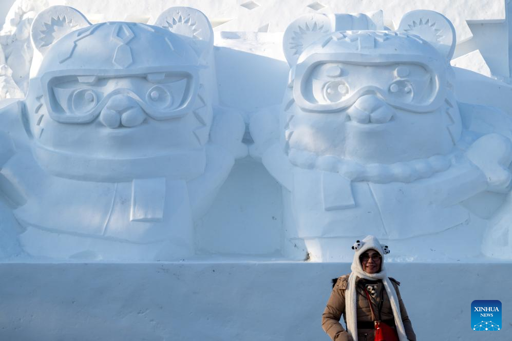 A tourist poses for photos with a snow sculpture of mascots of the 9th Asian Winter Games Harbin 2025, in Harbin, northeast China's Heilongjiang Province, on Jan. 8, 2025. The countdown to the 9th Asian Winter Games Harbin 2025 hits the 30-day mark on Jan. 8, 2025. (Xinhua/Zhang Tao)