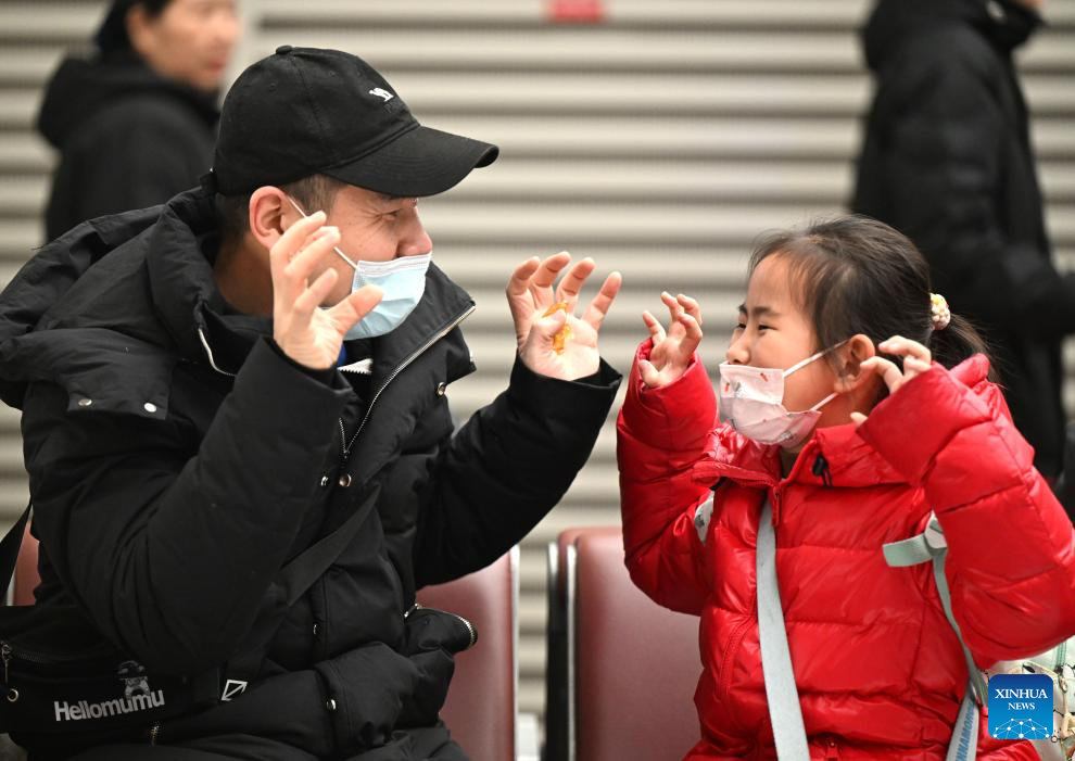 A father plays a game with his daughter at Zhengzhou East Railway Station in Zhengzhou, central China's Henan Province, Jan. 14, 2025. The Spring Festival, China's biggest traditional holiday, will fall on Jan. 29 this year. The Spring Festival travel rush, or chunyun, the world's largest annual human migration known for its high transportation demand as millions return home for family reunions, kicked off on Tuesday. (Xinhua/Li Jianan)