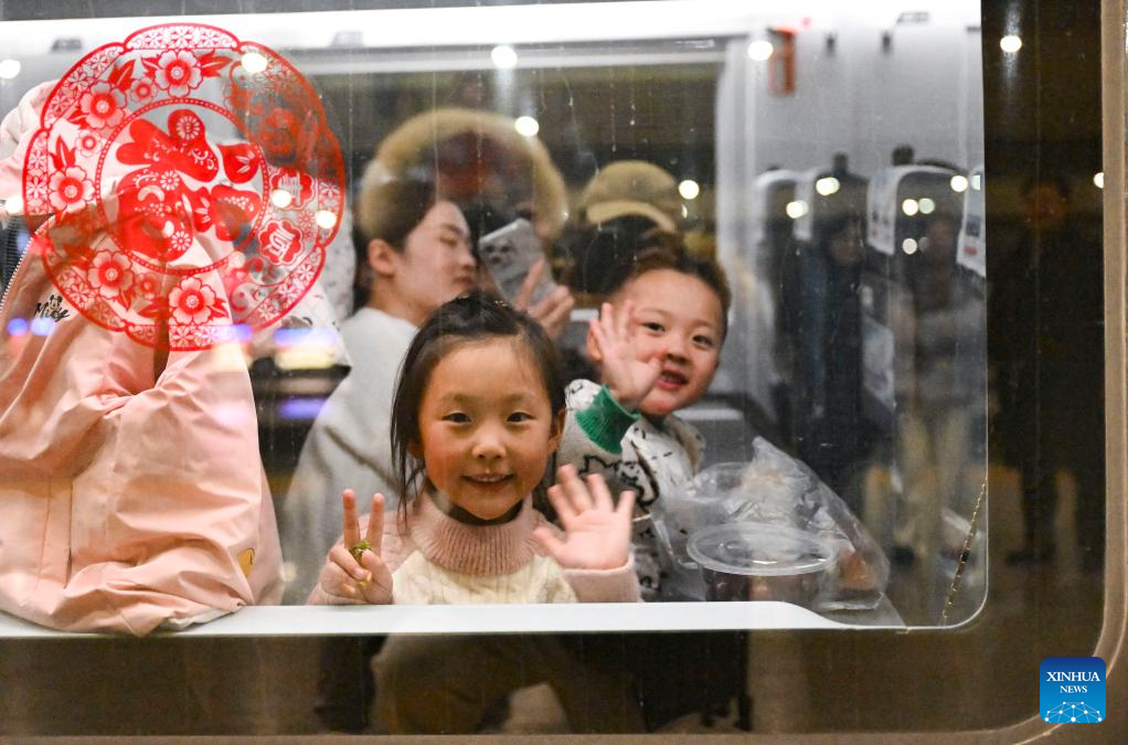 Two kids gesture aboard a train bound for Guiyang, southwest China's Guizhou Province, at Shanghai Hongqiao Railway Station in east China's Shanghai, Jan. 14, 2025. The Spring Festival, China's biggest traditional holiday, will fall on Jan. 29 this year. The Spring Festival travel rush, or chunyun, the world's largest annual human migration known for its high transportation demand as millions return home for family reunions, kicked off on Tuesday. (Photo by Chen Haoming/Xinhua)